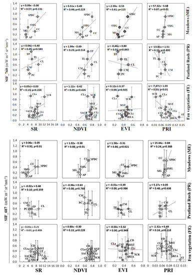 Correlation analysis of SIF at 760 nm and at 687 nm with selected remotely-sensed vegetation indices (SR, NDVI, EVI, and PRI) at vegetation community level restricted to peatland area. Plant communities were grouped in three categories comprised of meadows (ME), peatland rush vegetation (PR), and fen vegetation (FE), and were presented separately for each group. Codes names correspond to those provided with Figure 3. Error bars represent standard deviation.