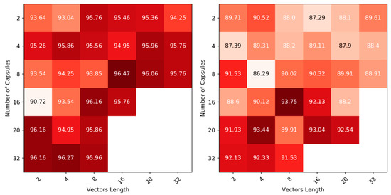 Adding more layers to the network may inflate the processing load, notwithstanding the potential to overfit the training data. If both scenarios are well-approached, classification gains might be envisioned, since deeper features convey richer information. Thus, we study the behavior of the network when an extra Caps layer is added. Therefore, two parameters are to be assessed (i) number of capsules and (ii) the length of the output vectors in these capsules. Figure 3 provides a heatmap of the accuracy in terms of both parameters (white cells represent cases that the capacity of the adopted GPU could not handle).