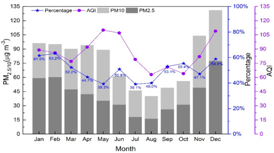 Figure 2. Variation of monthly averaged AQI (air quality index), concentrations of particulate matter (PM)2.5/10, and the ratio between PM2.5 and PM10 (in %) during 2017. The data shown are an average over the data collected at the nine national control monitoring stations in the city of Nanjing shown in Figure 1.