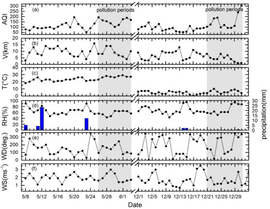Daily values of the AQI for the two study periods in May/June and in December 2017, averaged over all sites used in this study, are shown in Figure 3 together with visibility (V), temperature (T), relative humidity (RH), wind speed (WS), and direction (WD) measured in Nanjing. Visibility in the YRD region has decreased at a rate of 2.4 km decade−1 [49]. The data in Figure 3 show that visibility is inversely proportional to AQI, which is due to the aerosol component of the AQI and associated particle scattering and absorption. For the current study, two episodes with severe pollution were selected with low visibility and high AQI, as indicated in Figure 3. The summer episode is the period from 26 May to 2 June, and the winter episode is 21–30 December. The maximum AQI values during these two pollution episodes were 193 and 304; air temperature, relative humidity, WD, and wind speed (WS) were also different during these two periods. This is consistent with the results of Yu et al. [36,50]. We also note that the average temperature during the pollution episodes was higher than that before and after the episode. The average temperatures during the two pollution episodes were 28.5 °C and 6.2 °C, respectively.