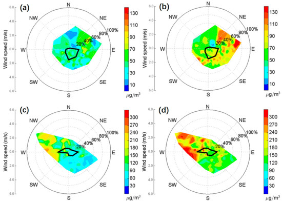 Figure 4. Concentration contours of PM2.5/10 (in μg m−3) overlaid on wind roses for PM2.5 during summer (a) and winter (c) episodes, and similarly for PM10 during summer (b) and winter (d) episodes. PM2.5/10 concentrations (in μg m−3) are color-coded following the color scale to the right of each wind rose. The overlying thick black lines indicate wind direction frequency (%). The wind speed (in ms−1) scale is provided to the left of each figure.