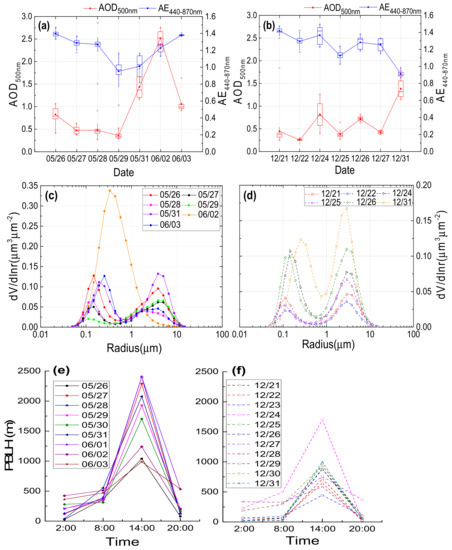 Figure 5. Daily averaged (a,b) AOD (aerosol optical depth) at 500 nm (AOD500 nm) and AE (Angstrom Exponent) at 440–870 nm (AE440–870 nm), (c,d) VSD (volume size distribution), (e,f) PBLH (planetary boundary layer height) during the two pollution episodes. PBLH was provided from the National Center for Environmental Prediction’s 1°-grid-spacing operational Global Forecast System Final Analyses.