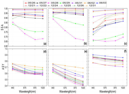 Figure 6. Spectral variation of SSA (single scattering albedo) and ASY (asymmetry factor) during the two pollution episodes (a,d) total mode, (b,e) fine mode, (c,f) coarse mode.