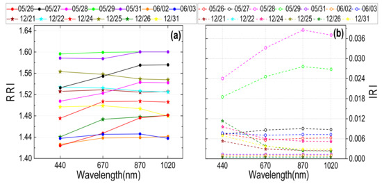 The aerosol refractive index, i.e., the real (RRI) and imaginary (IRI) parts describe the scattering and absorption properties, respectively, depending on the chemical composition of the aerosol particles. Figure 7a,b shows the spectral variations of RRI and IRI over Nanjing for specific days for which SSA was retrieved from the sun photometer measurements (i.e., requiring AOD values of 0.4 or higher) [59]. The average values of the RRI ranged from 1.42(05/26)–1.60(05/29) for short wavelength (440 nm) and 1.44(06/03)–1.60(05/31) for long wavelength (1020 nm), respectively. The IRI variation with wavelength is opposite to the spectral variation of SSA. The value of IRI varied between 0.0005–0.024 at 440 nm to 0.0011–0.038 at 1020 nm. Therefore, from the spectral properties of IRI, we can find that higher values of IRI indicate stronger absorption during summer episode, likely from biomass burning activities, whereas lower values indicate the presence of scattering aerosols [25].