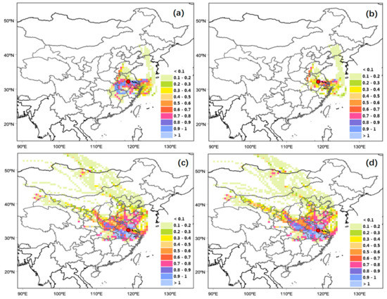 For the summer pollution episode (see Figure 8a,b), a large number of air mass trajectories originated over the ocean, but their contribution to PM2.5/10 was small (<0.2). The potential source areas, including the Yangtze River Delta region, the northern part of Zhejiang province, the central and southern part of Anhui province, and the junction of Anhui, Hubei, and Jiangxi province, were most likely leading to the high PM2.5/10 concentrations in Nanjing. According to the CWT analyses (see Figure 9a,b), the relative contributions of each potential source to the highest concentration values exceeded 70–90 μg m−3. In contrast, for the winter pollution episode, the cells with high PSCF values were located mainly in the Jiangsu province, Anhui province, northern part of Zhejiang province, and the northwestern part of Shandong and Henan province (see Figure 8c,d). The contributions to the PM2.5 and PM10 mass concentrations in Nanjing were about 80 μg m−3 and 150 μg m−3 (see Figure 9c,d). At the same time, the larger concentrations were distributed in some parts of Shaanxi, Ningxia, Gansu, and Inner Mongolia.