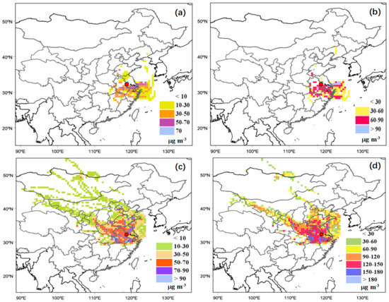 Aerosols are produced by local emissions and atmospheric process, while also long-distance transport of atmospheric constituents originating from other regions is an important factor in the variation of aerosol concentrations in Nanjing. Therefore, PSCF and CWT are used to calculate and analyze the potential source areas and their contribution to PM concentrations and their variation in different seasons in the northern suburbs of Nanjing. In this study, the criterion of PM2.5 was set to 75 μg m−3 and PM10 was set to 100 μg m−3 for the polluted concentration, which is based on the national secondary standard as the threshold value. Using 500 m as the mean height of the atmospheric boundary layer in the study area, TrajStat was used to simulate the 72-h backward trajectory of air masses arriving at the receptor point at NUIST. The results in Figure 8 show the different air mass origins and air flow patterns of the air masses arriving in Nanjing in summer and winter. The concentration-weighted air mass trajectories (CWT) in Figure 9 show that the source areas and their contributions to PM2.5/10 are different during heavy pollution episodes in summer and winter.