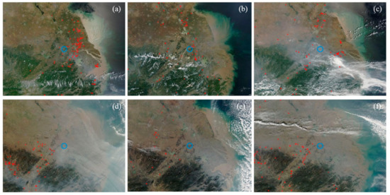 Figure 10. True color images derived from MODIS 2 km fires counts (a) 20170526.terra, (b) 20170527.aqua, (c) 20170602.terra, (d) 20171224.aqua, (e) 20171225.terra, and (f) 20171226.aqua.