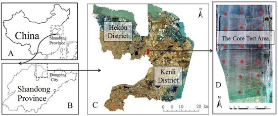 A farm of the “Bohai Granary” project located in the Hekou District was selected as the core test area, in which field measurements were performed and a UAV flight test was carried out. The differences in the soil salt content throughout the core test area are obvious, and the field contains all salinization grades; thus, this field served as the foundation for the universality of the soil salinity inversion model. In addition, the Kenli District was chosen as the verification area to validate the inversion results from the UAV-based model on the satellite image after reflectance normalization (Figure 1).