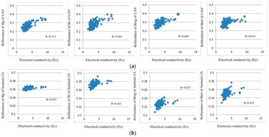 Scatter plots between the soil salinity and the spectral reflectances of the UAV (a) and Sentinel-2A (b) imagery.