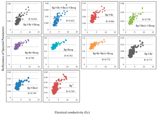 Figure 3 shows the R values between the spectral parameters based on the UAV imagery and the soil salinity (p < 0.01). Clearly, the correlation between the soil salinity and the reflectance of combined bands increases significantly compared with the correlation between the soil salinity and the reflectance of a single band. The band combinations with R > 0.76 were selected as spectral parameters for the construction of the inversion model.