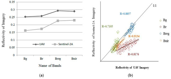 Comparison (a) and scatter plot (b) of the surface reflectances of the UAV and Sentinel-2A imagery.