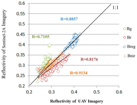 The normalized coefficients of each band were calculated from the reflectivity of the UAV and Sentinel-2A imagery (Table 4), and the reflectance correlations of the normalized Sentinel-2A and UAV images are shown in Figure 5.