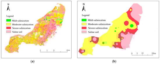 The soil salinity spatial distribution map (a) and the soil salinity interpolation map (b) are shown in Figure 6. The spatial distribution characteristics of soil salinity in Figure 6a are similar to those in Figure 6b, which proves that the spatial accuracy of the inversion is relatively high.