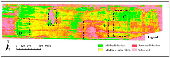 Figure 7 presents the soil salinity inversion results in the core test area (0.3 km × 1.2 km). The proportions of soil belonging to the different salinization grades are shown in Table 7.