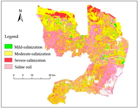 Figure 8 illustrates the soil salinity inversion results based on the best inversion model and Sentinel-2A imagery after applying reflectance normalization. The distribution map of the soil salinity levels in the study area in 2018 was obtained, and the areal proportion of each soil salinity grade was calculated accordingly (Table 8).