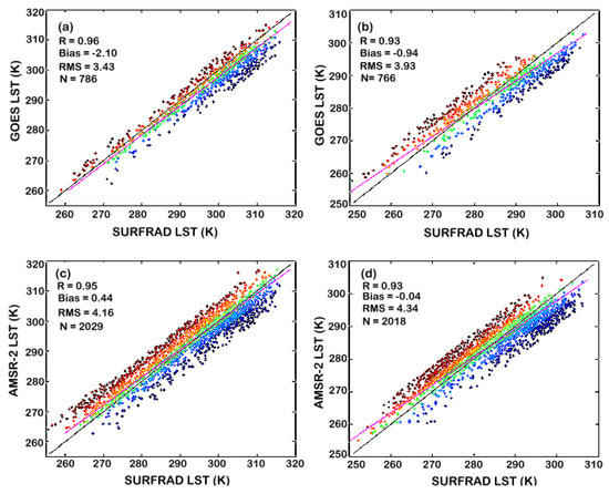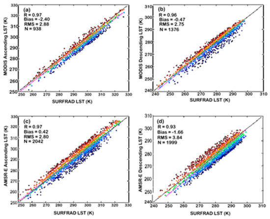 31] developed an LST algorithm while using the Advanced Microwave Scanning Radiometer (AMSR) multi-channels at 6.6, 10.7, and 18.7 GHz. Mao et al. [