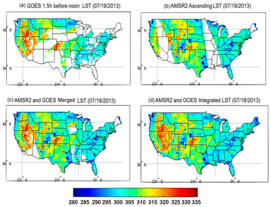41]. On the other hand, microwave sensors, such as the polar orbiting satellite sensor AMSR-EOS (AMSR-E), onboard the same Aqua satellite as the MODIS), can penetrate non-rainy clouds. The AMSR-E stopped rotating on 4 October 2011. Fortunately, a similar instrument AMSR-2 on JAXA’s GCOM-W1 spacecraft was launched on 18 May 2012, and it is currently operating. Both the AMSR-E and AMSR-2 can provide LST twice a day (the Equator crossing time 1:30 pm and 1:30 am) under all weather conditions. How to utilize the multiple instruments’ advantages is an important approach in remote sensing. Kou et al. [