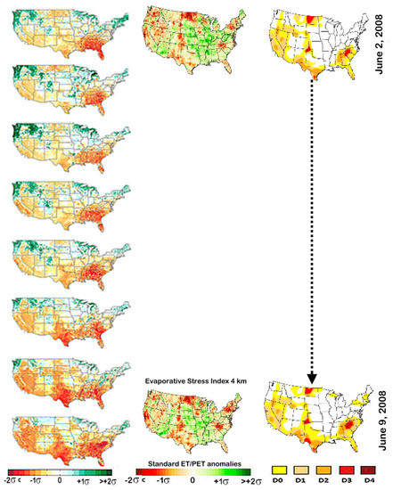 38]. The drought started in 2011, extended rapidly in 2012 (especially in June and July according to the USDM classifications), and then continued in 2013. This event was pervasive in the central regions of the United States due to the absence of rainfall in the growing season. The rapid soil moisture loss led this event as “flash drought” [