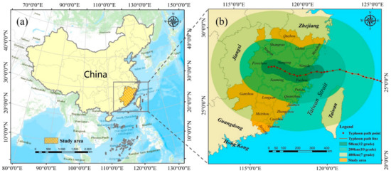 A typhoon is an extreme weather event with excessive destructive force [1] and is one of the most serious natural disasters on Earth. The southeastern coastal areas of China, which are intensively populated and extensively developed, are vulnerable to frequent typhoons. The annual economic losses and casualties caused by typhoon disasters in this region are enormous [2]. With increased climate variability in recent decades, many super-typhoons occurred in the northwestern Pacific Ocean [3]. The super-typhoons, characterized by strong winds, heavy rainfall, and storm surges, which can cause extremely high loss of lives and widespread damage to properties and infrastructures, have been widely investigated [4,5].