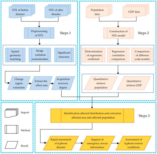 In this study, the NTL data before and after the typhoon disaster were processed with geometric matching and image data normalization, which can help extract the unbiased information of land surface changes caused by the typhoon. The data also recorded the affected area and the degree of recovery. Using information regarding the population and GDP, we conducted correlation models between NTL data and population or GDP and used the best models from different scales. The models were used for quantitatively retrieving the population and GDP. Finally, the research identified the distribution of the affected area and estimated the affected area and affected the population. The information obtained was used to analyze the temporal–spatial distribution of the typhoon disaster and rapidly determined the degree of recovery. The result can provide supplementary data to support emergency rescue efforts and recovery assessment. The research process is outlined in Figure 2.