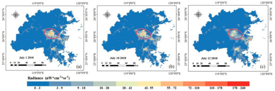 The nighttime light images before and after the strong typhoon Maria in Fuzhou: (a) Stable nighttime light before typhoon Maria, (b) constant nighttime light intensity before typhoon Maria, (c) the nighttime light intensity in middle areas was greatly reduced after typhoon Maria.