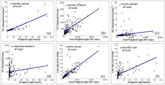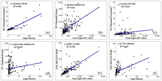 Regression model of between nighttime light (NTL) intensity and population or gross domestic product (GDP): (a) Light density versus population density (PD), (b) total light versus total population (TP), (c) total light versus PD, (d) light density versus TP, (e) total light versus GDP, (f) light density versus GDP.