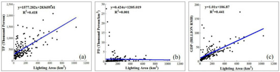 Regression model between NTL area and population or GDP: (a) Light area versus total population (TP), (b) light area versus population density (PD), (c) light area versus GDP.
