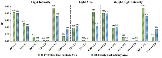 As shown in Figure 7, the correlation at the prefecture level is greater than at the county level for PD vs. LD, GDP vs. TL, PD vs. WLD, and GDP vs. TWL.