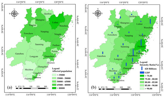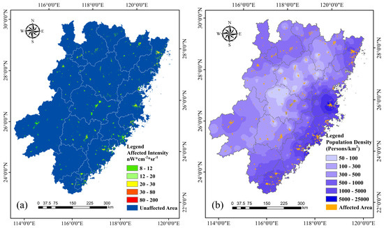 As per the calculation method used in this research, the research area was divided into 20 cities according to the prefecture level. Several small areas that were not affected by cloud layer and noise were selected as statistical samples in each city. Mean and variance for samples of the NTL image of each city were calculated separately. For each sample from the 20 cities, the statistical parameters for normalized radiation were calculated (see Table A2). After the typhoon disaster, the affected areas and the specific distribution of each city were calculated (see Figure 8a). At the same time, based on the relationship between the stable yearly NTL images for the research area in 2016 and the population density in 2016, the quantitative population density in 2018 was retrieved from the NTL images in 2018 and interpolated, and the results were superimposed onto the retrieved distribution map of the typhoon-affected areas (see Figure 8b). The extracted areas of impact were mainly concentrated in the densely populated areas along the eastern coast of the research area and in the built-up areas of inland cities.