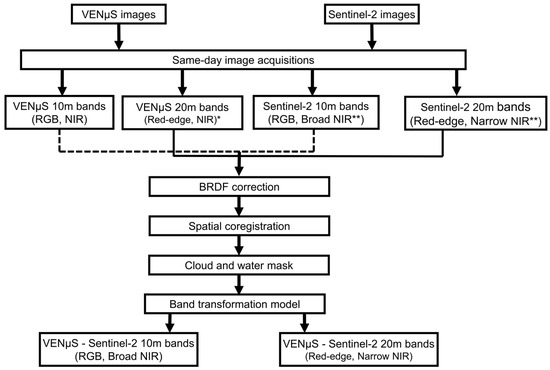 The processing chain for the development of transformation models between VENμS and Sentinel-2 reflectance imagery. * The VENμS red-edge bands (8–10) and near infra-red (NIR) band (11) were resampled to 20 m. ** The Sentinel-2 broad NIR and narrow NIR bands (i.e., bands 8 and 8A) were compared with the VENμS NIR band (11).