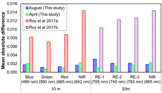 Mean absolute difference between Nadir BRDF Adjusted Reflectance (NBAR) in the overlapping regions of Sentinel-2 imagery (shown in Figure 1) during the months of April and August, which represent the spring and the summer (high vegetation coverage in spring vs. low vegetation coverage in summer). The values found in this study are compared against the values reported in Roy et al. [21,22] for the month of April. RE denotes Red-edge.