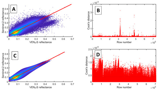 Scatter plot of VENμS and Sentinel-2 green band reflectance before (A) and after (C) removing the outliers using Cook’s distance method. Subplots (B,D) show the Cook’s distance case order plot for the respective scatter plots.