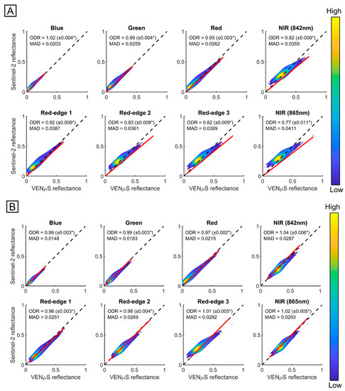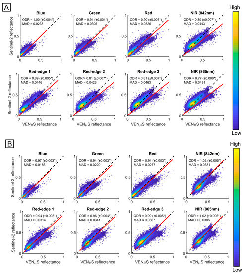 Scatter plots of VENμS and Sentinel-2 surface reflectance for the validation set of pixels. (A) prior to the transformation; and (B) post-transformation. The red line is the orthogonal distance regression (ODR) slope line showing the bias relative to the identity line (black-dashed line). A high point density is marked in yellow tones, while a low point density is marked in blue tones. * This margin of error represents the 99% confidence interval.