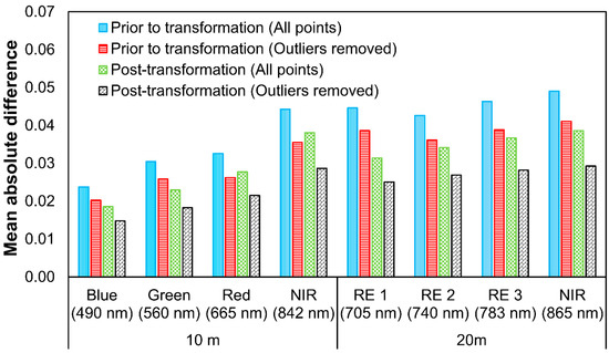 Mean absolute difference (MAD) between VENμS and Sentinel-2 reflectance, prior to transformation and post-transformation.