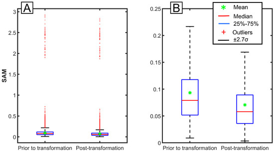 Turkey box plots of the spectral angle mapper (SAM) between VENμS and Sentinel-2 reflectance (A) Full validation dataset and (B) Post removal of outliers from the dataset.