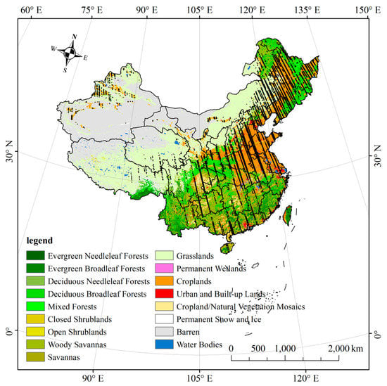 The trajectory of Orbiting Carbon Observatory-2 (OCO-2) passed by cropland from June to August 2015 in China. The land cover map is from the moderate resolution imaging spectroradiometer (MODIS) land cover type product (MCD12Q1) based on the IGBP (International Geosphere-Biosphere Programme) classification scheme.