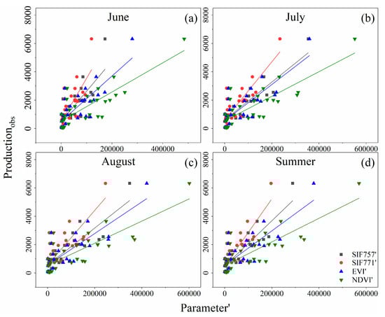 The correlations between the SIF757’, SIF771’, EVI’, NDVI’, and the government’s autumn crop production statistics (ten kilotons) in China during June to August 2015 at the monthly and seasonal scales. The parameter’ represent SIF757’ (W m−2 sr−1 μm−1), SIF771’ (W m−2 sr−1 μm−1), EVI’, and NDVI’, respectively.