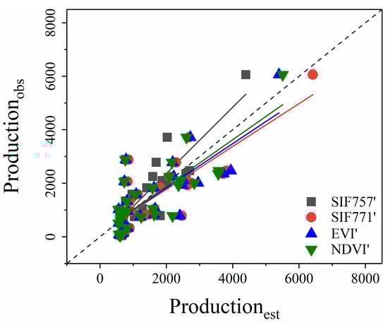 In addition, the correlations between VIs’ (EVI’ and NDVI’) and autumn crop production were not much different among the months, whereas the correlations between SIF’ (SIF757’ and SIF771’) and autumn crop production were much different among months. This result reveals that SIF can monitor crop dynamics better than VIs, which is in good agreement with the previous results [50,51,52,53], suggesting that SIF is able to precisely track the seasonality of photosynthesis and NDVI is insensitive to seasonal changes in photosynthesis. This finding further indicates that it is feasible to estimate autumn crop production while using satellite-derived SIF products. Additionally, the performance is better and more reliable than VIs.