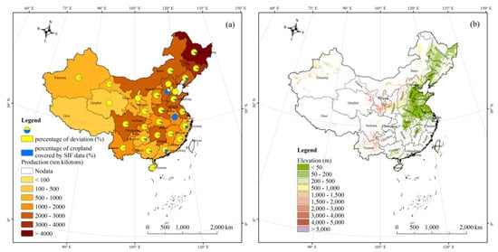 The lower the percentage of cropland covered by SIF data, the higher the deviation percentage of autumn crop production estimated while using the SIF757’. Meanwhile, in Beijing, Hainan, Qinghai, Tianjin, Ningxia, and Xinjiang, where the autumn crop production is approximately less than five million tons and the elevation is higher than 1000 m, the deviation percentage of autumn crop production estimated using the SIF757’ exceeded 100% (Figure 4a). Besides, in Sichuan, Chongqing, Hunan, Shaanxi, and other provinces with large undulating terrain and broken cropland, the autumn crop production that was estimated using the SIF757’ was also not very accurate (Figure 4).