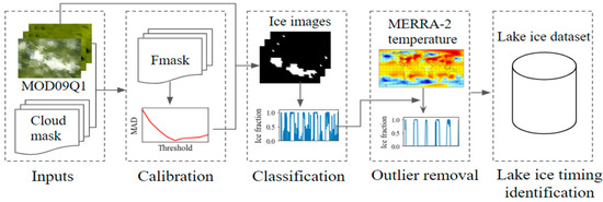 The algorithm for automatically calculating lake ice fraction and detecting lake ice timing contains five major steps is summarized in Figure 2. Firstly, cloud masks were used to remove cloudy pixels from each MODIS reflectance image (Section 2.3.1). Secondly, MODIS images were paired with same-day Landsat Fmask images to find the best reflectance threshold for differentiating ice from water. Thirdly, by counting the number of ice pixels on the ice classification image, the ice fraction over lake surface can be easily estimated and the time series of lake ice fraction is obtained (Section 2.3.2). Fourthly, a quality control operation was taken by using the air temperature data to filter out outliers in the time series of lake ice fraction (Section 2.3.3). Finally, lake breakup and freezeup dates for each lake over the 19-year study period were identified using the time series of lake ice fraction (Section 2.3.4).
