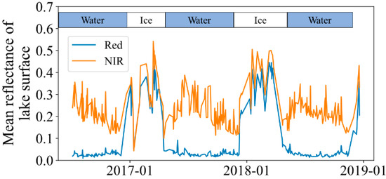 In this study, only the red band was chosen for classification, which is different from the previous studies that used a near-infrared (NIR) band [1,15,25] or the combination of both visible and NIR bands [29,30]. At the scale of MODIS imagery, small lakes are likely to be dominated by mixed pixels that have more than one land cover type. As vegetation has a lower reflectivity in the red band than the NIR band, using the red band to detect lake ice status can better remove the impact of changing vegetation. For example, Figure 3 clearly shows that the signal variation caused by the switch between water and ice in the red band is much clearer than in the NIR band. Due to the greater influence from mixed pixels, NIR reflectance during open water periods is highly relative to red reflectance, which is less vegetation-dependent. As such, it is more difficult to separate ice pixels from water using the NIR band alone. The threshold for classifying ice vs. water was selected by calibrating the lake ice fraction against Landsat Fmask (more details are given in Section 2.3.3).