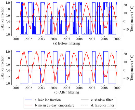 Time series of lake ice fraction and temperature over Silver Lake (a) before and (b) after filtering.