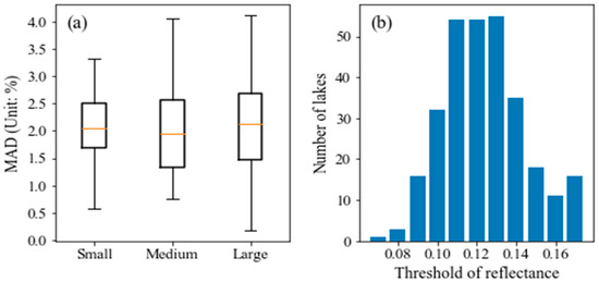 The thresholds are controlled by multiple factors such as water turbidity, fraction of non-water pixels and types of non-water pixels. For example, the reflectance of a mixed pixel containing vegetation could be quite different from pixels containing high-reflectance land-type such as urban area. The optimal thresholds selected for lakes ranges from 0.07 to 0.17 (Figure 5b). The most common thresholds were 0.11, 0.12 and 0.13. They were identified for 54, 54, and 55 lakes, respectively. Lakes with thresholds from 0.11 to 0.13 accounted for 55% of the total lakes. To test their temporal stability, we also calibrated the thresholds during three subsets (2000–2005, 2006–2011, 2012–2018) of the study period. Slight variations of the thresholds were detected. The mean absolute difference between the thresholds calibrated during the whole period and the thresholds which were calibrated during the three sub-periods were 0.011, 0.013 and 0.013, respectively, which suggests the thresholds were relatively stable during the study period.