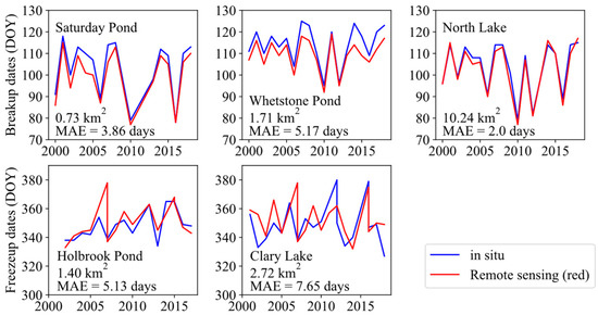The time series of breakup and freezeup over lakes with full records of in situ data show strong similarities when measured using in situ and remotely sensed approaches (Figure 6). Due to incomplete in situ data, only three lakes have complete breakup records and two lakes have full freezeup records (no missing data from 2000 to 2018). As shown in Figure 6, the variability of lake ice timing was generally captured well by the remote sensing approach. There was a good agreement between remotely sensed breakup dates with in situ observation. However, larger bias existed in the time series of freezeup, especially for Clary Lake, where a 20-day difference was found in 2012.