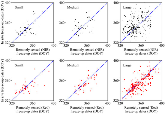 Compared with the NIR-based algorithm, the proposed algorithm outperformed in all cases except bias in small and medium groups. Although a higher bias in the case of the red band method suggests lower accuracy, a low MAE and NRMSE mean the absolute value of freezeup dates detected by the proposed algorithm were closer to in situ observations.