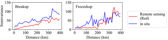 We examined the spatial correlation of lake ice timing by using semivariogram analysis [31] (Figure 8) for both results from the proposed algorithm and in situ data. Since the extent of in situ data is not consistent for each year, we selected 2017 to test the spatial auto-correlation of lake ice timing based on the fact that 2017 had the most observations during the study period. In total, there were 54 observations of freezeup and 141 breakups in situ observations. The equation for calculating semi-variance is shown in Equation (3).