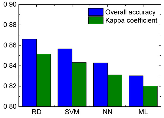- Raczko, E.; Zagajewski, B. Comparison of support vector machine, random forest and neural network classifiers for tree species classification on airborne hyperspectral APEX images. Eur. J. Remote Sens. 2017, 50, 144–154. [Google Scholar] [CrossRef]