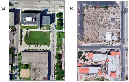 Visual imagery of the case study locations: Marquette University (a) and University of Texas El Paso (UTEP) (b). Visual imagery of Marquette was captured from a drone on 11 August 2018. Visual imagery of UTEP was pulled from Google Maps on 13 March 2019.