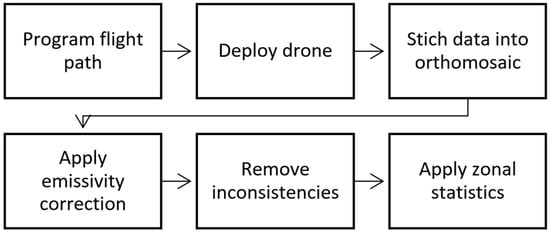 Once the thermal data were corrected for emissivity, spatial data analysis was performed in ArcMap. First, a land use feature map was created that categorized the surface types in each case study location. Then inconsistencies within these areas, such as a parked car within a parking lot, human traffic on a sidewalk or construction materials on the street, were clipped and removed for each flight. Once these inconsistencies were removed, zonal statistics was applied to compute summary statistics of each surface type such as mean and standard deviation of the land surface temperature. A complete flow-chart of the process from flight programming to developing summary statistics is shown in Figure 2. In total this process took about 3 h to complete for each flight.