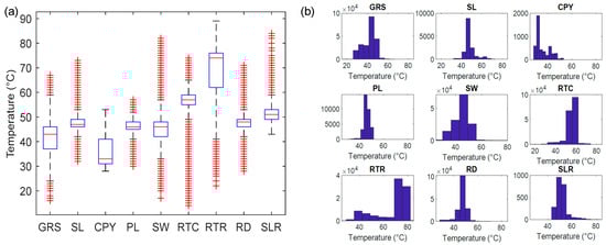 Boxplot distribution of surface temperature (a); and histogram of surface temperature (b). Data from flight recorded on July 11, 2018. Note GRS = grass; SM = shrub/mulch; CPY = canopy; PL = parking lot; SW = sidewalk; RTC = composite rooftop; RTR = rubber rooftop; RD = road; SLR = solar.